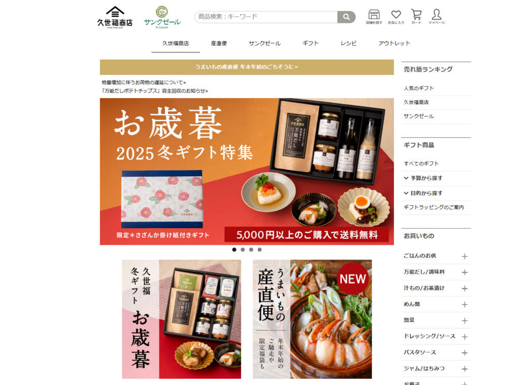 【PR】サンクゼール&久世福商店オンラインショップ 今回ご紹介するのは、おいしいものがとことん揃った食を中心とした心地よいライフスタイルをご提案する通販サイトですテレビなどでも取り上げられており、 今注目を集めています!お中元や内祝い、ギフトやちょっとしたプレゼントにもおすすめです♪☆おすすめポイント☆◎長野県飯綱町の工場で作った、オリジナルのワイン、ジャム、パスタソースなどを販売◎万能だしをはじめとする調味料やお酒、お菓子、珍味など和をテーマにした豊富な商品を取りそろえられております。 今回ご紹介するのは、おいしいものがとことん揃った食を中心とした心地よいライフスタイルをご提案する通販サイトですテレビなどでも取り上げられており、 今注目を集めています!お中元や内祝い、ギフトやちょっとしたプレゼントにもおすすめです♪☆おすすめポイント☆◎長野県飯綱町の工場で作った、オリジナルのワイン、ジャム、パスタソースなどを販売◎万能だしをはじめとする調味料やお酒、お菓子、珍味など和をテーマにした豊富な商品を取りそろえられております。 詳細はこちらをクリック おすすめ商品 2026福袋 <松>セール価格: 6,400 円 【数量限定・オンライン限定】年末年始に家族みんなで楽しめる12品を詰め合わせました。ごはん&パンのお供や、混ぜご飯の素など、何かと忙しい年末にぴったりなアイテムがたっぷり入っています。※12/5(金)19時発売 【数量限定・オンライン限定】年末年始に家族みんなで楽しめる12品を詰め合わせました。ごはん&パンのお供や、混ぜご飯の素など、何かと忙しい年末にぴったりなアイテムがたっぷり入っています。※12/5(金)19時発売 お決まりギフト大人のしゃけしゃけめんたい入り3,880 円 【オンライン限定】人気のギフト!メディアで度々紹介される「万能だし」「しゃけしゃけめんたい」、旬の野菜がおいしく楽しめる「ドレッシング」が入ったイチオシギフトです♪お歳暮にもおススメですね☺ 【オンライン限定】人気のギフト!メディアで度々紹介される「万能だし」「しゃけしゃけめんたい」、旬の野菜がおいしく楽しめる「ドレッシング」が入ったイチオシギフトです♪お歳暮にもおススメですね☺ おすすめ情報 商材名 サンクゼール&久世福商店オンラインショップ運営者 H.Y※当サイトはアフィリエイトプログラムを利用し宣伝目的で作成しております。